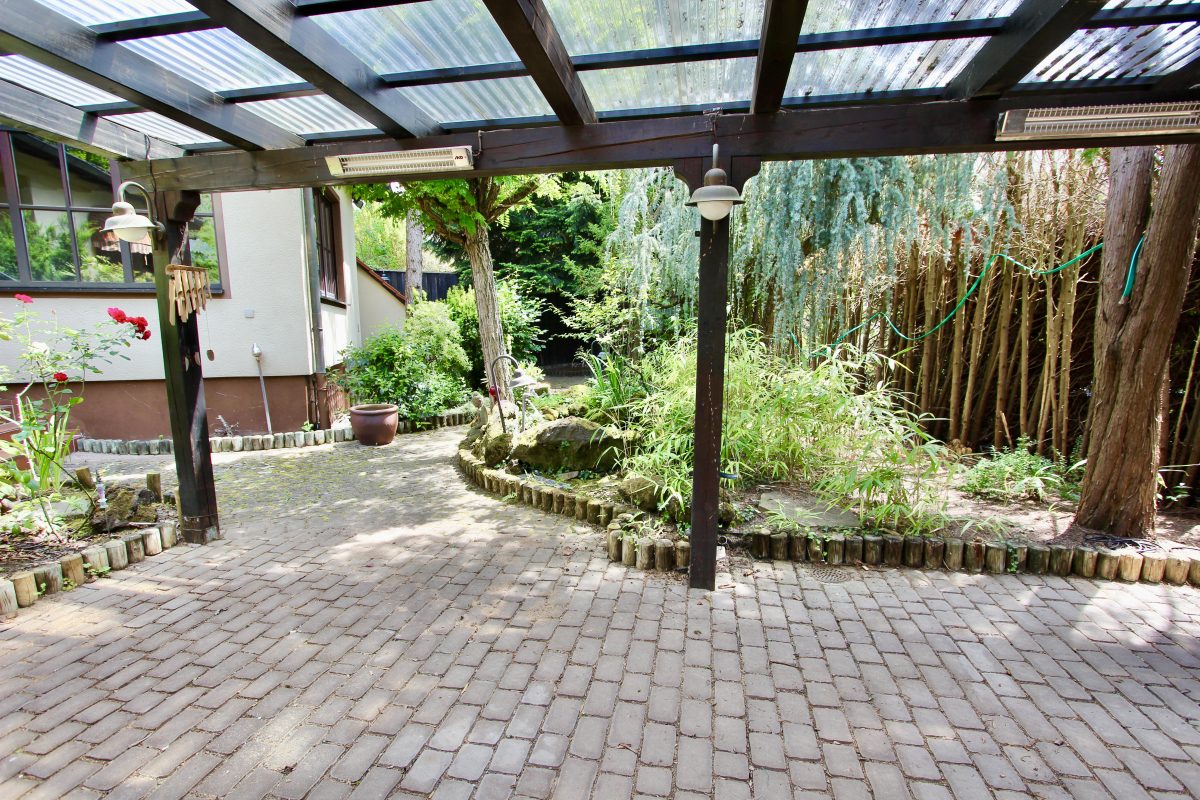 • Große Terrasse mit Überdachung und eingebauten Heizstrahlern; Gartenteich mit Umwälzpumpe