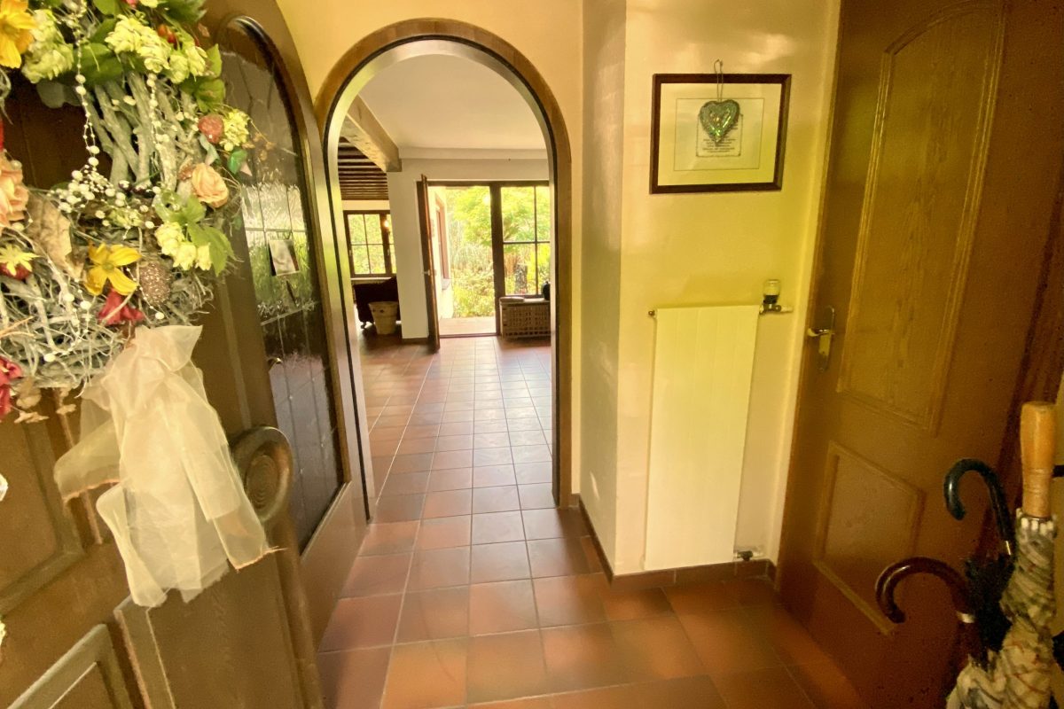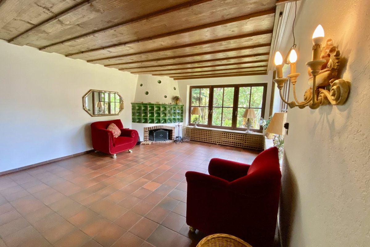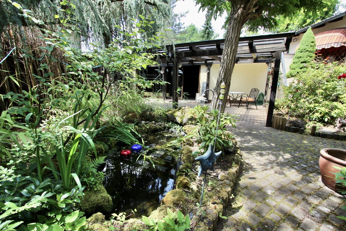 Zwischen Haupthaus und Schwimmhalle befinden sich liebevoll angelegte Grünflächen mit einem Teich, großzügiger Terrassenfläche, sowie einem überdachten Sitz- und Liegebereich.