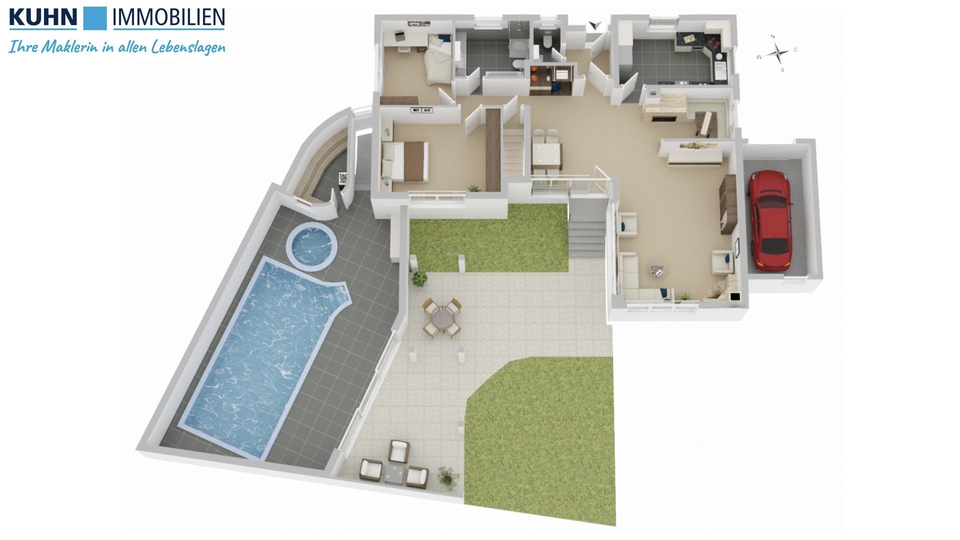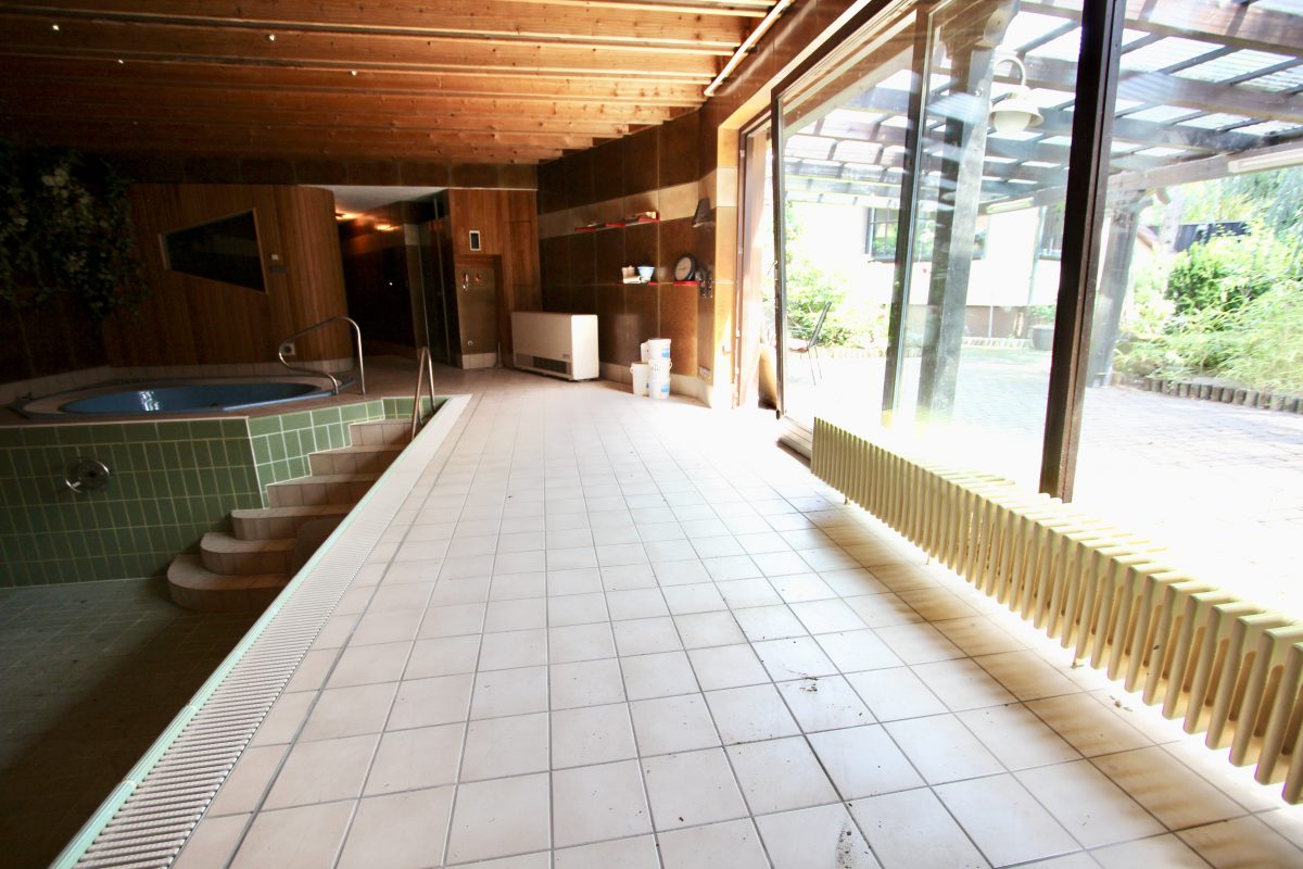 Ein besonderes Highlight dieser Immobilie ist die im Jahr 1989 vom damaligen Eigentümer – einem Unternehmer aus der Heizungs- und Sanitärbranche – errichtete private Schwimmhalle mit integrierter Sauna und Whirlpool. Hier genießen Sie Wellness pur, in Ihren eigenen vier Wänden. Das große Schwimmbecken mit Gegenstromanlage ermöglicht Ihnen aber auch ein gesundes Ganzkörpertraining – bequem zu Hause, ganz ohne Fahrt ins Schwimmbad.